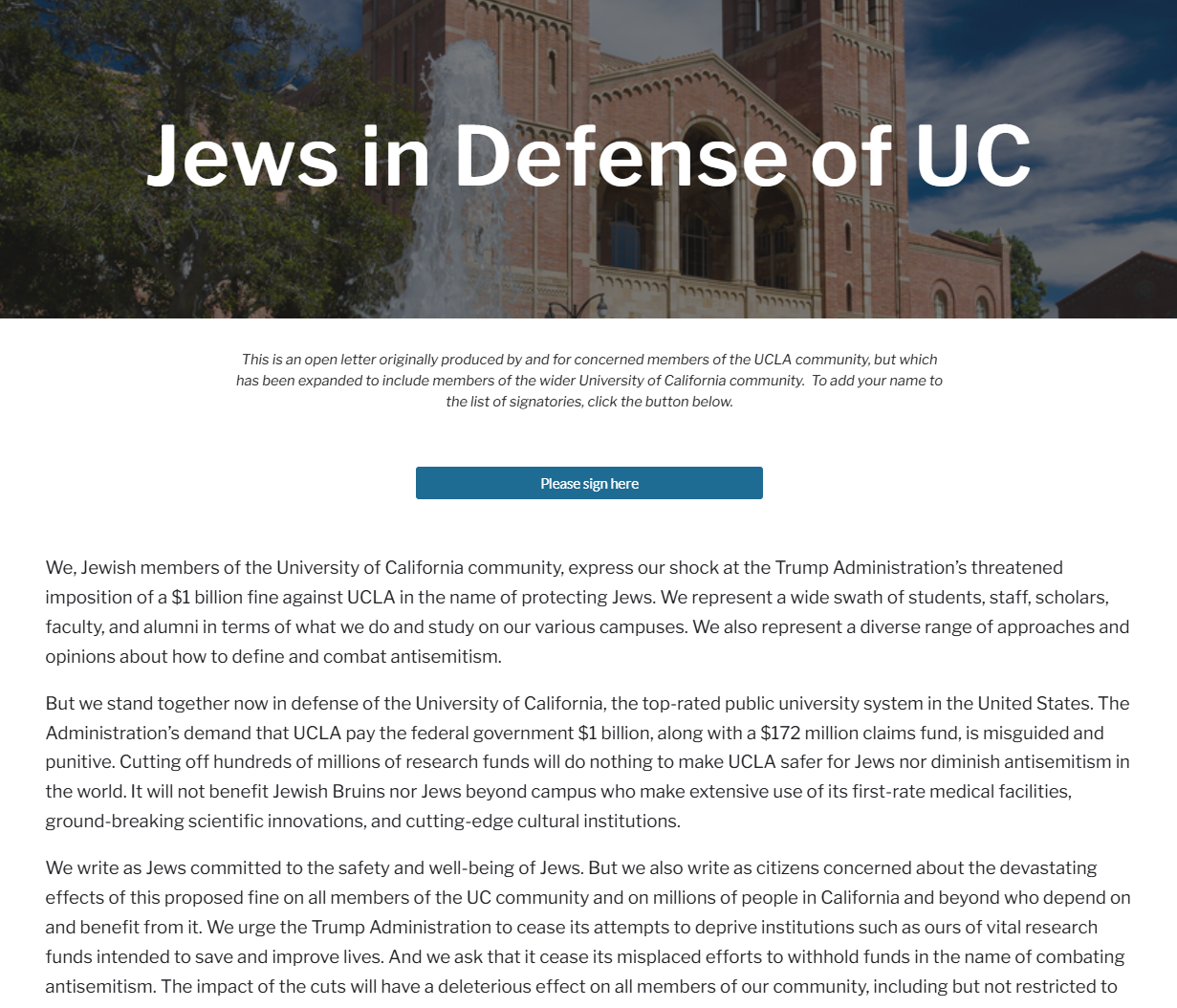 A letter signed by more than 500 Jewish professors from a range of political views was sent to the UC Board of Regents criticizing the Trump Administration’s “misguided and punitive” demand for a $1-billion fine to settle claims over alleged antisemitism at UCLA. The letter insists that payment of the fine “will do nothing to make UCLA safer for Jews nor diminish antisemitism in the world” and will halt critical research and services used by Jewish students and staff at UCLA. Read the full letter here.