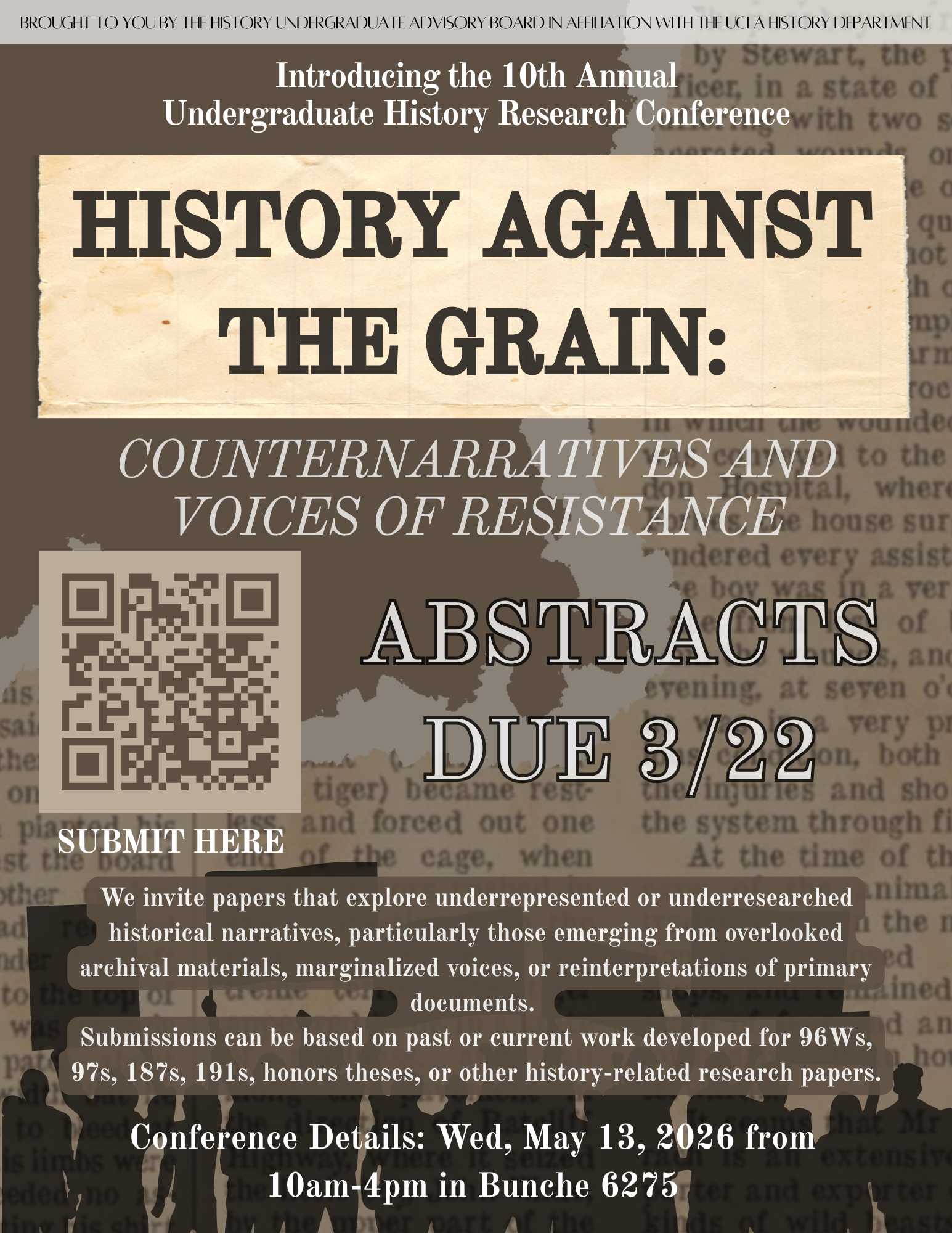 It is our great pleasure to announce the Tenth Undergraduate History Research Conference entitled “History Against the Grain: Counternarratives and Voices of Resistance” to be held on Wednesday, May 13th, 2026. We are accepting abstracts for consideration until Sunday, March 22 (11:59pm PT).