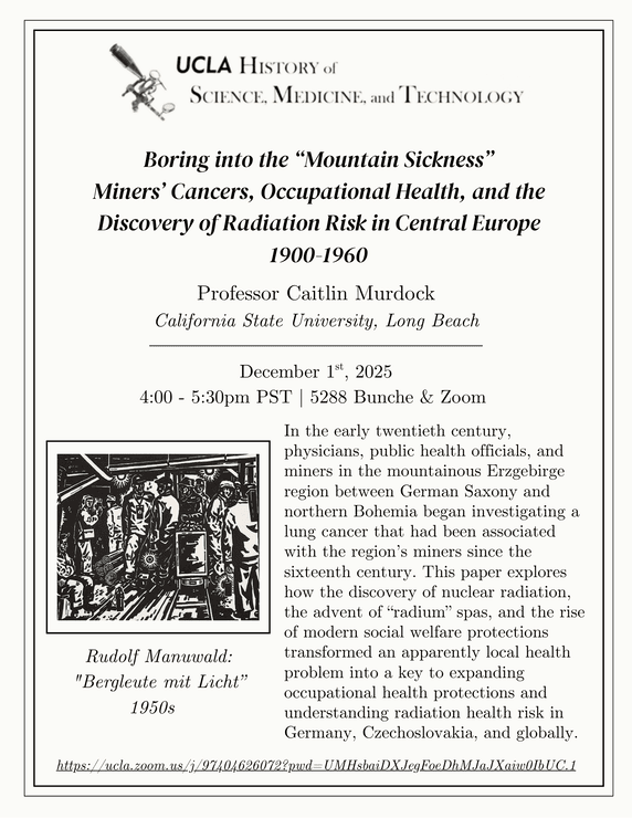 Everyone is welcome to the next installment of the History of Science, Medicine, and Technology Colloquium Series. California State University, Long Beach’s Professor of History Dr. Caitlin Murdock will be presenting Boring into the “Mountain Sickness” Miners’ Cancers, Occupational Health, and the Discovery of Radiation Risk in Central Europe.