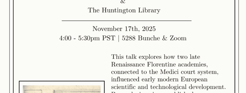 Everyone is welcome to the next installment of the History of Science, Medicine, and Technology Colloquium Series. Cristiano Zanetti will be joining us- he is a Postdoctoral Teaching Fellow at Caltech and a long-term Research Fellow at the Huntington Library. Cristiano will be presenting “Engineering the Engineer at the Medici Court in the Age of Galileo.”