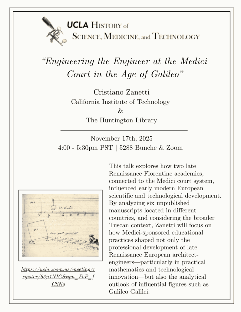 Everyone is welcome to the next installment of the History of Science, Medicine, and Technology Colloquium Series. Cristiano Zanetti will be joining us- he is a Postdoctoral Teaching Fellow at Caltech and a long-term Research Fellow at the Huntington Library. Cristiano will be presenting “Engineering the Engineer at the Medici Court in the Age of Galileo.”