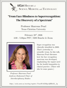 Everyone is welcome to the first installment of the History of Science, Medicine, and Technology Colloquium Series. Professor Sharrona Pearl of Texas Christian University will be presenting “From Face Blindness to Superrecognition: The Discovery of a Spectrum.”