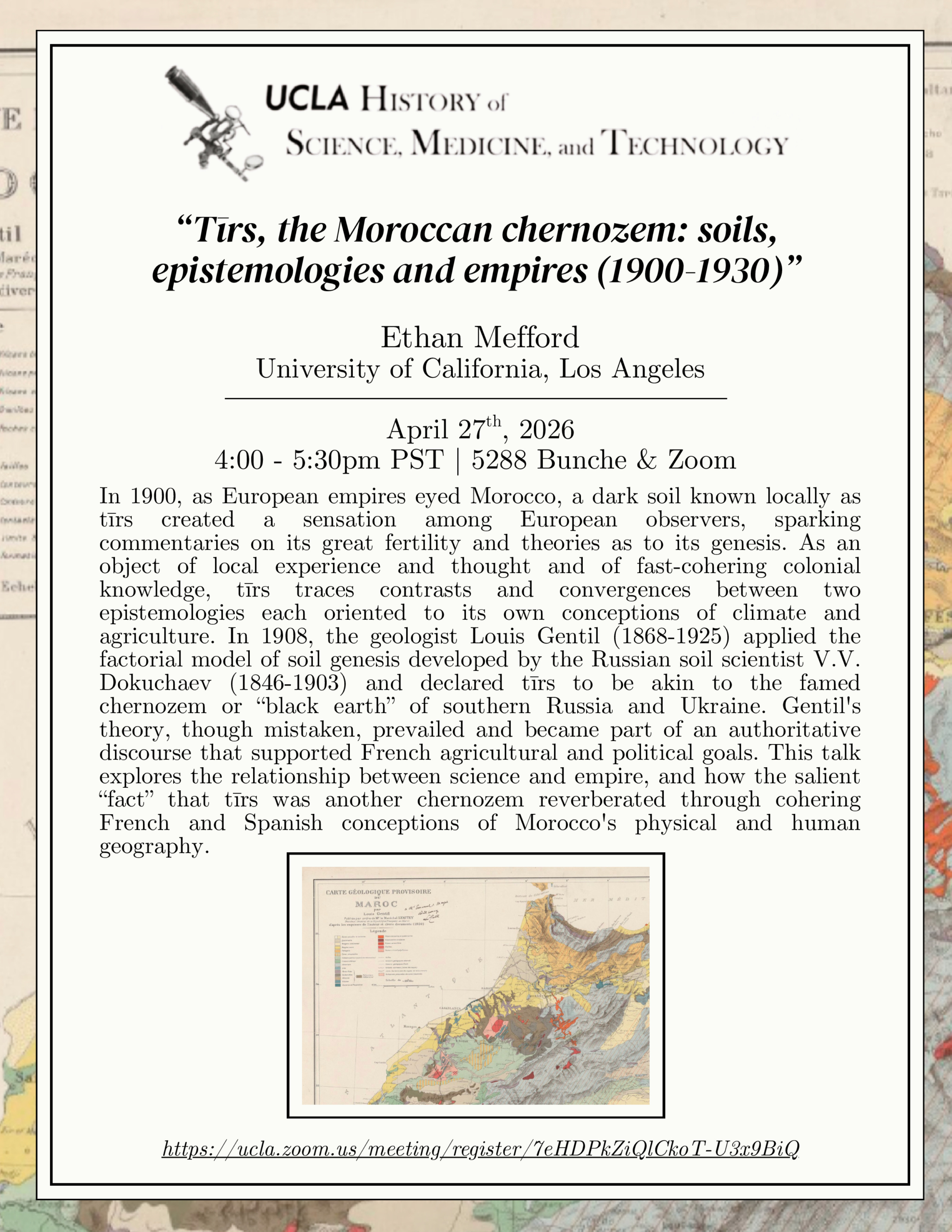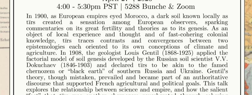 Everyone is welcome to the next installment of the History of Science, Medicine, and Technology Colloquium Series. UCLA’s Ethan Mefford, will be presenting “Tīrs, the Moroccan chernozem: soils, epistemologies and empires (1900-1930)”