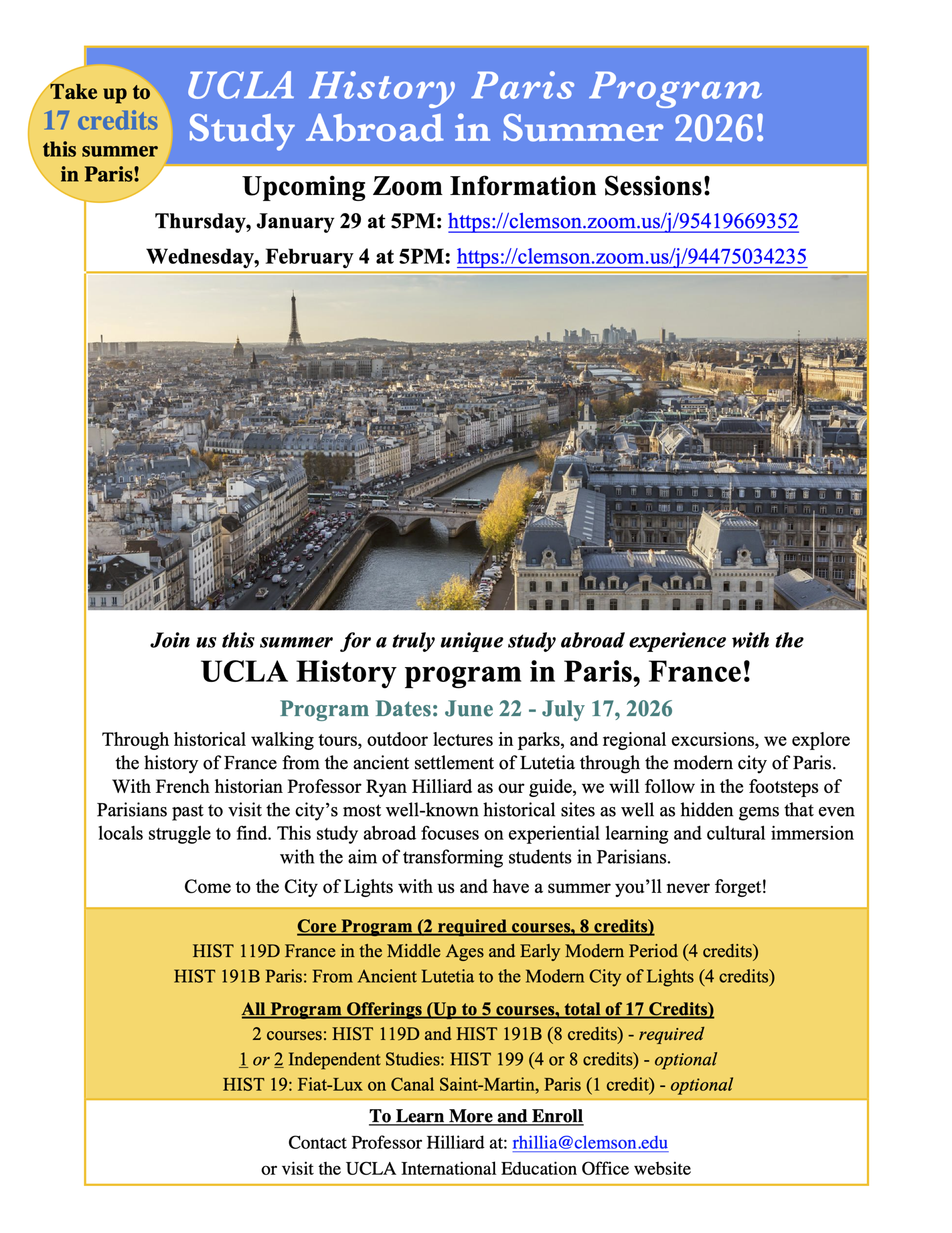 Interested in studying abroad in Paris during the summer? An info session on Paris will be offered Thursday, January 29th via zoom.