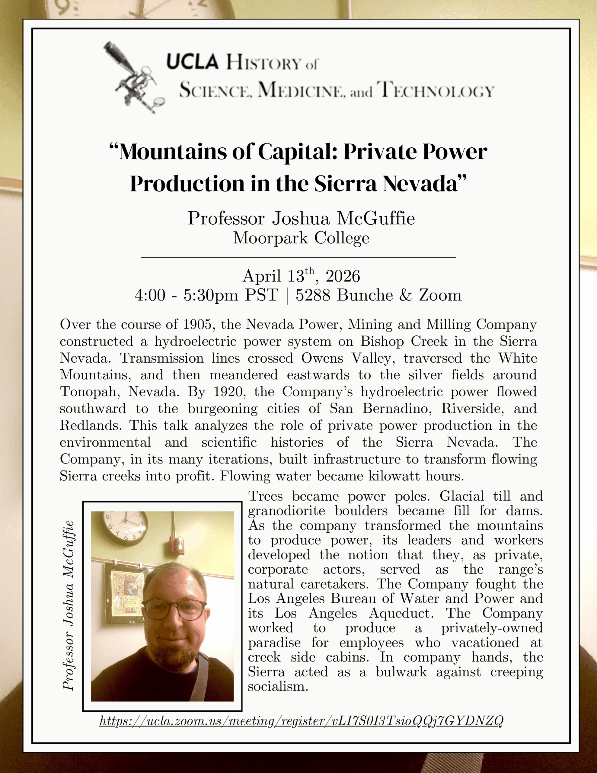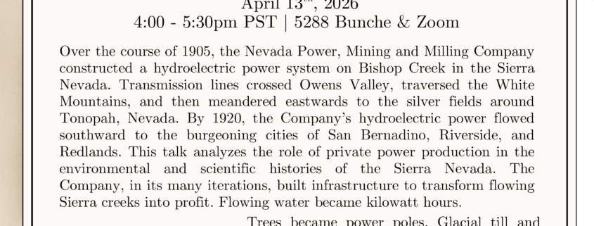 Moorpark College Professor, Joshua McGuffie, will be presenting “Mountains of Capital: Private Power Production in the Sierra Nevada.”