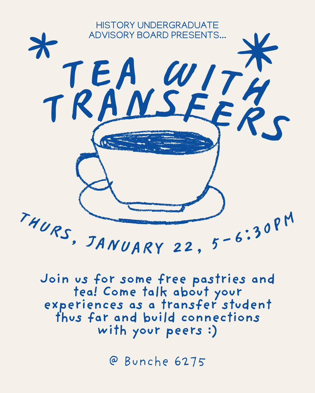 You are warmly invited to the History Department’s Tea with Transfers, hosted by the History Undergraduate Advisor Board (HUAB). Join us for a relaxed and welcoming space to connect with fellow transfer students, reflect on your first quarter at UCLA, and learn how HUAB can support you moving forward.