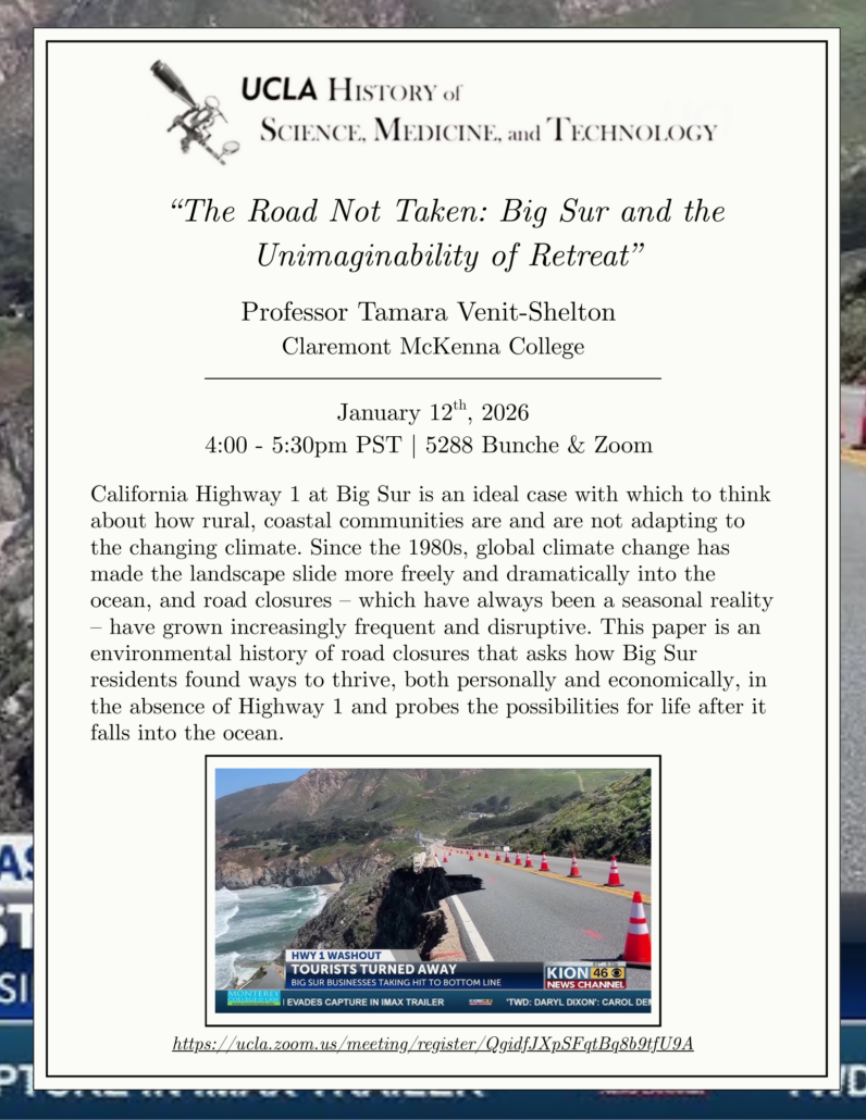 Everyone is welcome to the next installment of the History of Science, Medicine, and Technology Colloquium Series. Dr. Tamara Venit-Shelton, Professor of History at Claremont McKenna College, will be joining us. She is a will be presenting “The Road Not Taken: Big Sur and the Unimaginability of Retreat.”