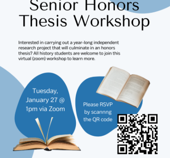 Interested in carrying out a year-long independent research project that will culminate in an honors thesis? Our department will be hosting a workshop for interested students on Tuesday, January 27th at 1pm via Zoom. Please RSVP via https://forms.gle/tEWuck56HYvbWidx7.