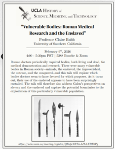 Everyone is welcome to the next installment of the History of Science, Medicine, and Technology Colloquium Series. Dr. Claire Bubb, Visiting Associate Professor of Classics at USC, will be joining us. She is a will be presenting “Vulnerable Bodies: Roman Medical Research and the Enslaved.”