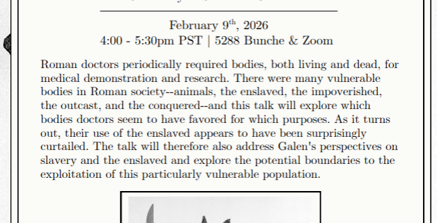 Roman doctors periodically required bodies, both living and dead, for medical demonstration and research. There were many vulnerable bodies in Roman society–animals, the enslaved, the impoverished, the outcast, and the conquered–and this talk will explore which bodies doctors seem to have favored for which purposes. As it turns out, their use of the enslaved appears to have been surprisingly curtailed. The talk will therefore also address Galen’s perspectives on slavery and the enslaved and explore the potential boundaries to the exploitation of this particularly vulnerable population.
