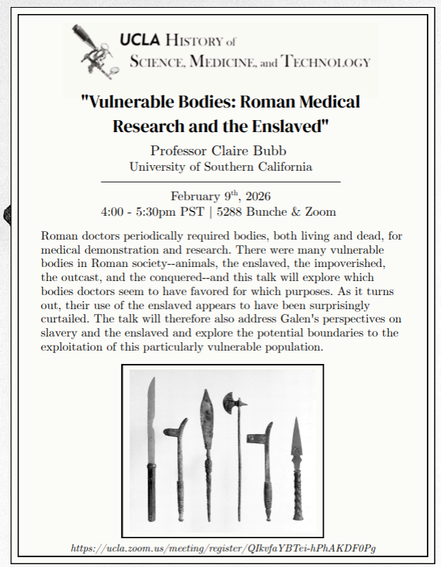 Everyone is welcome to the next installment of the History of Science, Medicine, and Technology Colloquium Series. Dr. Claire Bubb, Visiting Associate Professor of Classics at USC, will be joining us. She is a will be presenting “Vulnerable Bodies: Roman Medical Research and the Enslaved.”